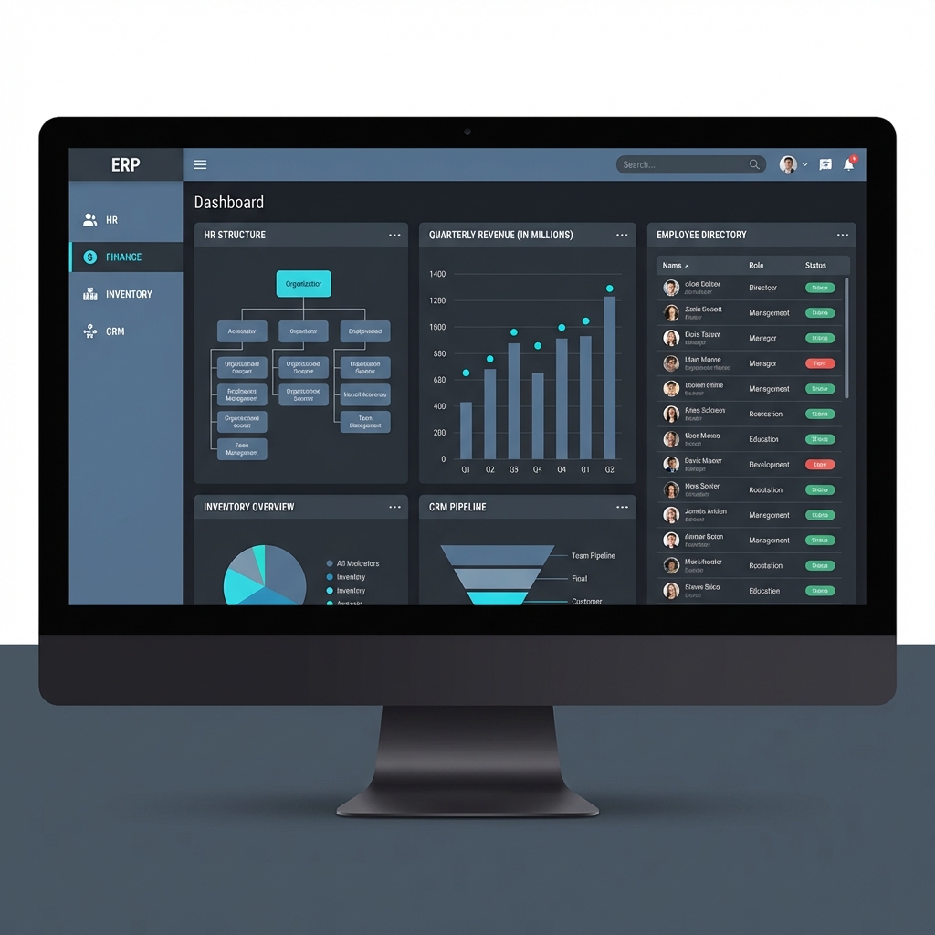 A comprehensive ERP system consolidating HR, Finance, Inventory, and CRM modules into a unified, data-driven dashboard for large-scale operations.